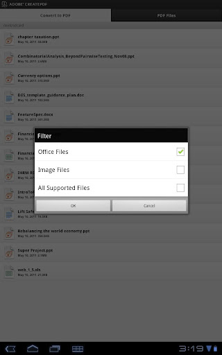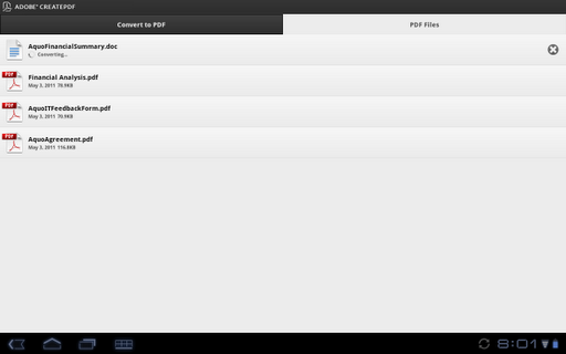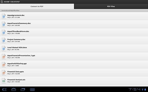 Adobe CreatePDF brings the same high-quality PDF creation as Adobe Acrobat to your Android Tablet and Smartphone. Convert all your Office, Photoshop, Illustrator, InDesign, Image, Text, and RTF files to PDF, and share the converted PDF using Adobe CreatePDF application.