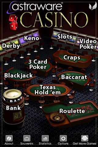Astraware Casino features 11 of the most popular casino games in 1 pack: Texas Hold 'Em Poker (Limit and No Limit), Roulette, Slots, Blackjack, Craps, Baccarat, Keno, Video Poker, Video Derby, and 3 card Poker. Astraware Casino includes instructions on how to play each of the games. Higher stake tables are unlocked as you play and fun awards for your Souvenir Suitcase earn Open Feint points and achievements.