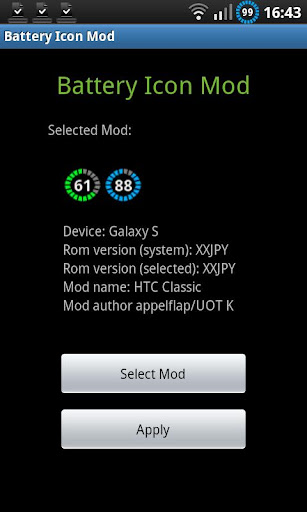 | Name: Battery Icon Mod Entwickler: Impaled Applications Preis: Größe: 215k | Version: 1.01 minimale Android Version: 2.1 oder höher Kategorie: Personalisierung Download: Look at the bottom of the page |