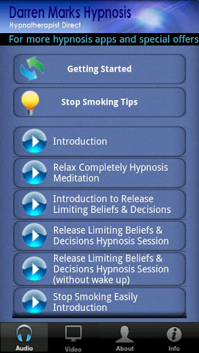 Stop smoking easily with this combination of state of the art hypnosis sessions and video interviews from Darren Marks one of the UKs leading hypnotherapists and trainers. Hypnosis can't make you stop smoking against your will but if you're determined to stop this App will make it much easier and even a relaxing, empowering and enjoyable process.