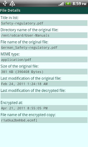 Encryption Manager ist ein Dateimanager, der es erlaubt einfach und sicher mit vertraulichen Dateien zu arbeiten. Vertrauliche Dateien werden verschlüsselt (AES) auf der SD-Karte gehalten und bei Bedarf vor dem Anzeigen bzw. Bearbeiten automatisch entschlüsselt.