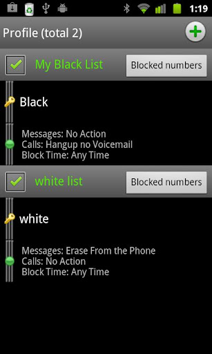 * Blocking profile: setup blocking profiles, in each profile setup sms blocking and call blocking options, choose to block at any time or on calendar schedule, add numbers to the profile to be blocked. Support wildcard matching of phone numbers, can easily block all numbers from an area code , or 800, 877, etc.