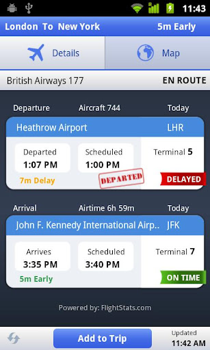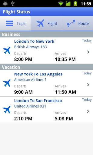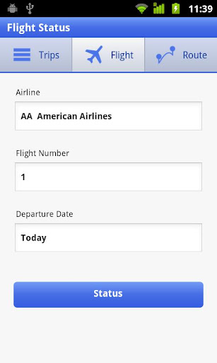 You can check the status of the flights by Flight Number or by Route. The Trips module lets you save and track flights.