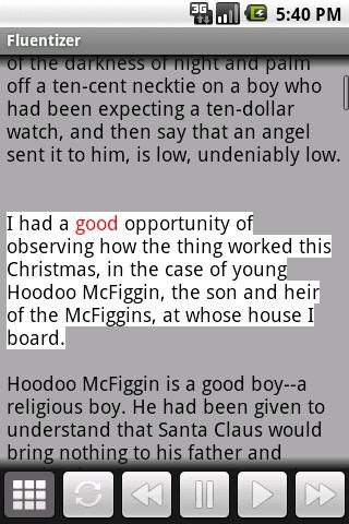 FluentEnglish will help you practice understanding native English speakers and increase your vocabulary. It works like an audio book reader and also provides translation for words that you don't understand. For better learning, it also provides pronunciations of each word in several different voices. To learn English with Fluentizer efficiently and to be able to use the dictionaries, your native language needs to be one of the following: Arabic, Armenian, Bulgarian, Chinese, Czech, French, German, Hindi, Croatian, Hungarian, Italian, Japanese, Korean, Persian, Polish, Portuguese, Russian, Spanish, Swedish, Thai, Turkish, Ukrainian, or Vietnamese.