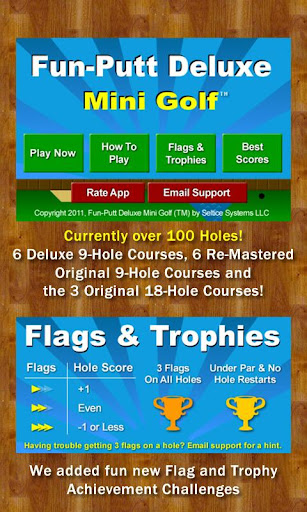 Mini golf game Fun-Putt Mini Golf has 100+ Holes and NEW hole & course achievements! An addicting game that's easy to learn but a CHALLENGE to master. Includes 3 18-hole courses and 11 9-hole courses. We will be adding more new courses soon at no extra charge.