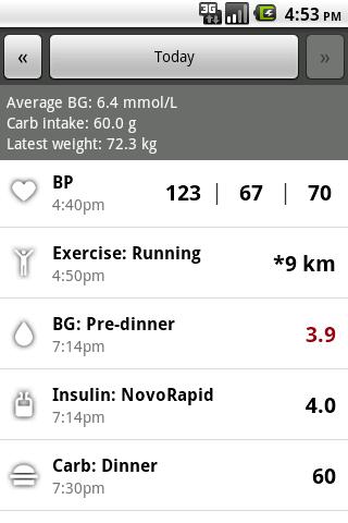 * A complete data tracker, for monitoring a wealth of data: blood glucose (BG), blood pressure (BP), insulin & medication doses, weight & BMI, carbs intake, exercise and HbA1c.