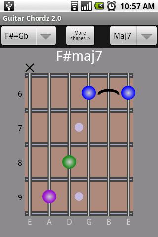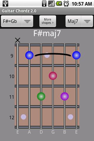 guitar chords right in your Android hand phone! Chords include :Major, Minor, Maj7, Add9, 6th, min7, aug, dim, sus and more..Listen to the "sound" of the chord by pretend-strum or tapping the screen!
