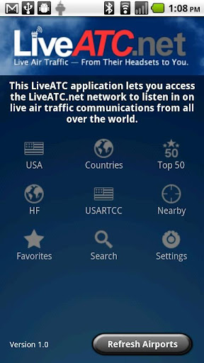 LiveATC for Android provides a quick and easy way to listen in on live conversations between pilots and air traffic controllers near many airports around the world. LiveATC for Android lets you browse by U.S. state or by country to find an airport and listen in to live air traffic conversations at or near a given airport. You can also use the "Nearby" feature to find an airport near you. You can then add any channel to your Favorites list for quick and easy access.