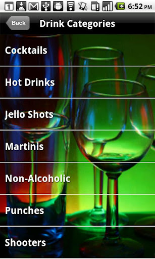 Cocktails, Martinis, Shooters, Jello Shots, Hot Drinks, Punches, alkoholfrei und Favoriten.