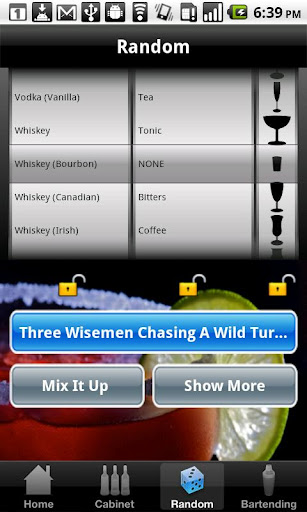 Der "Zufall"-Reiter sieht wie ein Glücksspielautomat aus, mit dem Sie zufällige Rezepte auf der Basis von Spirituosen-, Mixer- und Glaskriterien finden können. Die Spirituosenschrank- und Zufallsfunktionen sind leicht zu handhaben, weil wir mehr als 1.300 Zutaten in 87 Kategorien aufgegliedert haben.