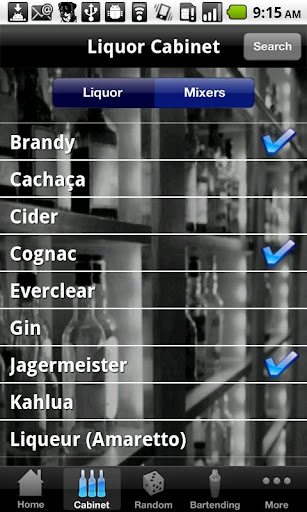 Unter dem "Spirituosenschrank"-Reiter können Sie alle Spirituosen- und Mixerarten eingeben, die Sie zur Verfügung haben - und die gesamte Datenbank nach den Cocktails durchsuchen, die Sie mixen können.