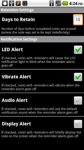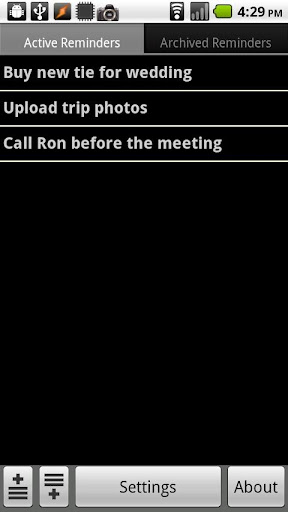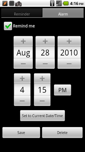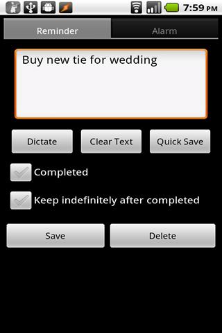 * It lets you schedule an alarm for those reminders that are time-sensitive. You can use the settings in the app to determine how the alarms should notify you (by default, the alarm will cause the phone to vibrate and the notification light to blink).