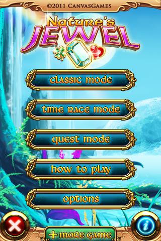 Nature's Jewel is a match-3 game similar to the likes of Bejeweled game.So simple, try to match 3 or more jewel to get your score but extremely addictive gameplay. There's 3 mode with 3 funny gameplay diffirent (Classic, Time race & Quest).
