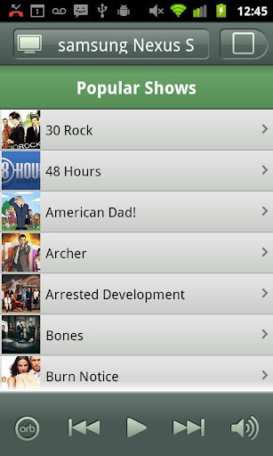 Videos. If you like TV shows, you’ll love Orb Live. All the shows from sites like Hulu, Comedy Central, Netflix and more are all available on your Android — in a single, integrated and easy-to-use app. Search for your favorite show, tap the season and episode you want to watch, and you’re streaming! If you have a TV tuner or webcam on your PC, you can even stream that directly to your phone. That’s right — live TV on your Android phone!