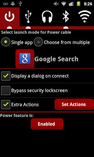 This app is a true "plug and play" app. It will launch a specified app or multiple apps to choose from in a dialog when the Power, USB, or Headset cables are connected to the device and also when a bluetooth headset device or wifi network is connected or disconnected. A Yes/No dialog can be displayed so it does not interfere with your current task. This app also features the ability to toggle the state of bluetooth, wifi, and ringer mode upon connecting or disconnecting the things mentioned above.