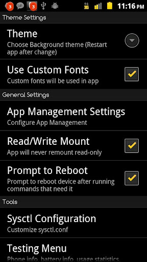 Root Tools allows you to customize the app and make it your own. You can change the entire look of it through theme settings in the main settings menu. Through settings you can also manage backups, access android hidden testing menu, enable or disable your boot animation, turn on/off camera shutter sounds and configure sysctl.conf to maximize performance for more advanced users.
