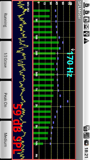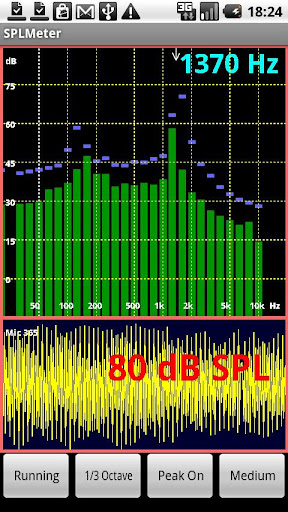 SPLMeter shows SPL (deciBels) of the Android's mic signals, and their frequency spectrum. The meter has three speeds: Fast, Medium and Slow. Shows peak envelope and frequency of maximum intensity, and clipping. ISO 1/3 Octave bars and Spectrogram.