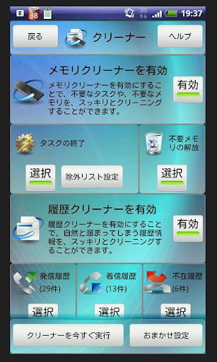 メモリ上に残っている不要なタスクやメモリ、履歴データ(ブラウザ閲覧履歴、Google play検索履歴など)をまとめてクリーニングすることで、動作をきびきびと速くします。
