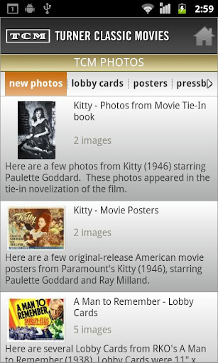 >Photo Galleries: Take a step into the past with the TCM Photo Archives - it’s your passport into the world of TCM’s classic movie image vaults. These unique galleries offer amazing views into films playing on TCM in categories such as original lobby cards, posters, press books, production photos, publicity stills and much more. It’s your DVD Bonus Material view into every title playing on Turner Classic Movies which is updated weekly.