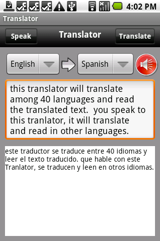 It becomes very handy when you learn foreign languages or travel aboard. The top right button translate from your local language to any other languages. The bottom left button will translate from bottom to top. Therefore, all languages in the list can translate among each other. Most importantly, it can read the translated languages for you as well. For example, when you travel to China, you can have this application translate your language to Mandarin and talk it out in Mandarin. It is very convenient for any travelers.