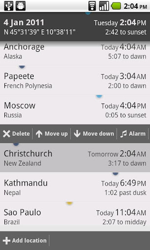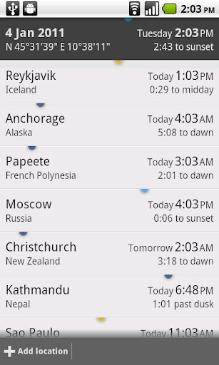 World Clock is a simple world clock for an editable list of locations around the world. Lists local times, days relative to your current one, and times to sunrise, sunset, dawn or dusk. Knob color indicates the local day phase.
